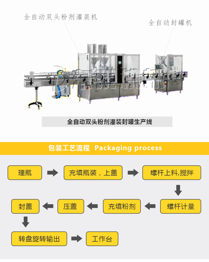 全自動粉劑灌裝機是我公司的主打產品,根據客戶的要求公司開發(fā)出了單頭、雙頭、四頭、六頭瓶裝生產線,全自動奶粉灌裝機專門針對藥品、保健品、食品行業(yè)的粉劑瓶裝。結合不同的客戶需求可配套:上料(螺桿、真空)、自動理瓶,單(雙)頭加塞、旋蓋、軋蓋、壓蓋等,鋁箔封口(風冷、水冷),金檢,鋁箔塞墊,貼標,碼瓶熱收縮,裝盒,三維包裝(帶金線),裝箱等。