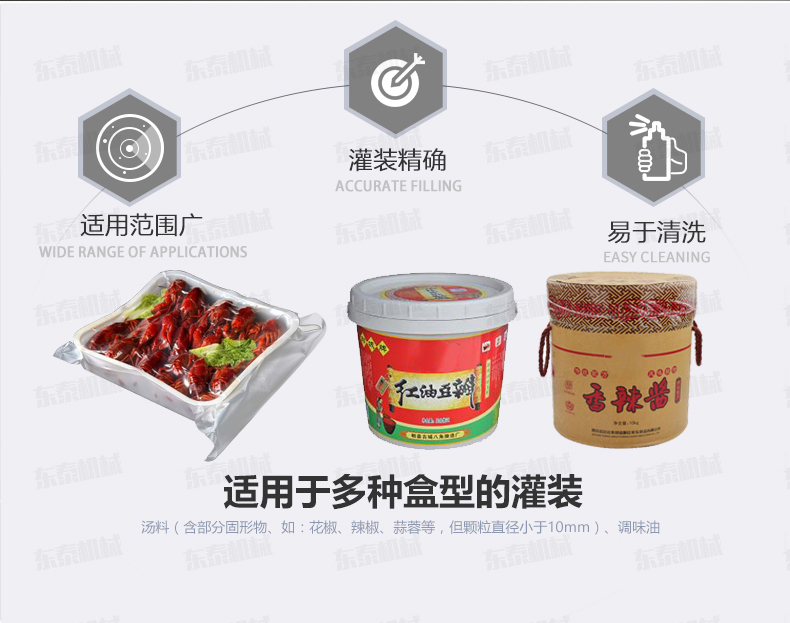 1.灌裝機(jī)在參考國外同類產(chǎn)品的基礎(chǔ)上進(jìn)行改良設(shè)計(jì),特制湯料、調(diào)味油灌裝頭,機(jī)械防滴漏保護(hù),在灌裝過程中不會污染包裝容器。