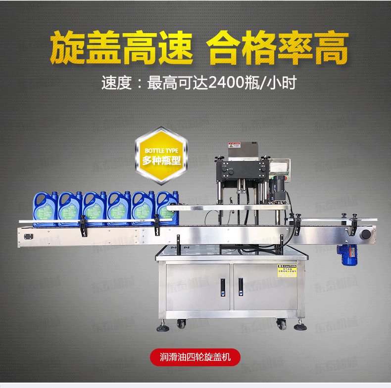 全自動旋蓋機是參照國機型改進設計、旋蓋速度快,合格率高、操作方便?蛇m用于食品、制藥、日化、農藥、化妝品等行業的不同瓶形的旋蓋。四臺調速電機分別用于供蓋、夾瓶、傳送、旋蓋,機器自動化程度高,穩定性好,調節方便,更換瓶形或蓋時無須備件,只需作調整即可完成(如配上蓋機,可進行自動上蓋)可以根據實際需要選配。