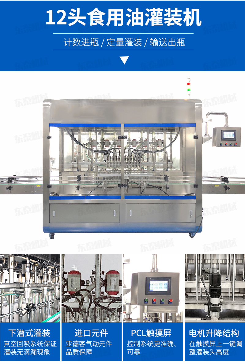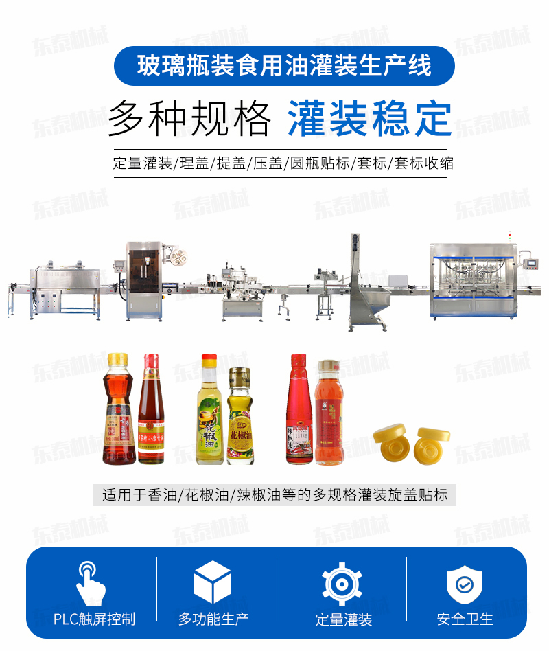 灌裝機簡述 該系列灌裝機采用容積式計量灌裝原理,適用于各種規(100ml-1000ml)的南瓜籽油、榛子油、牡丹籽油、芝麻油、核桃油、山茶油、亞麻籽油、棉籽油、橄欖油、大豆油、玉米油