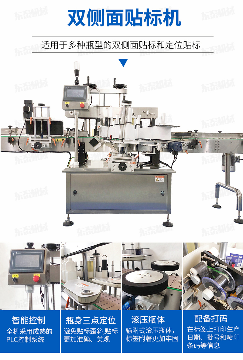 全機采用的技術,微電腦-PLC-電子光纖傳感器控制系統,使整機運行穩定、高速; 操作系統采用操作界面控制,操作簡便、實用、效率高,并有產量記數功能; 技術的速度快且穩定; 適用范圍大,可用于各種尺寸的圓形瓶貼標; 輸附式滾壓瓶體,使標簽附著更加牢固; 前后段可選連線使用。