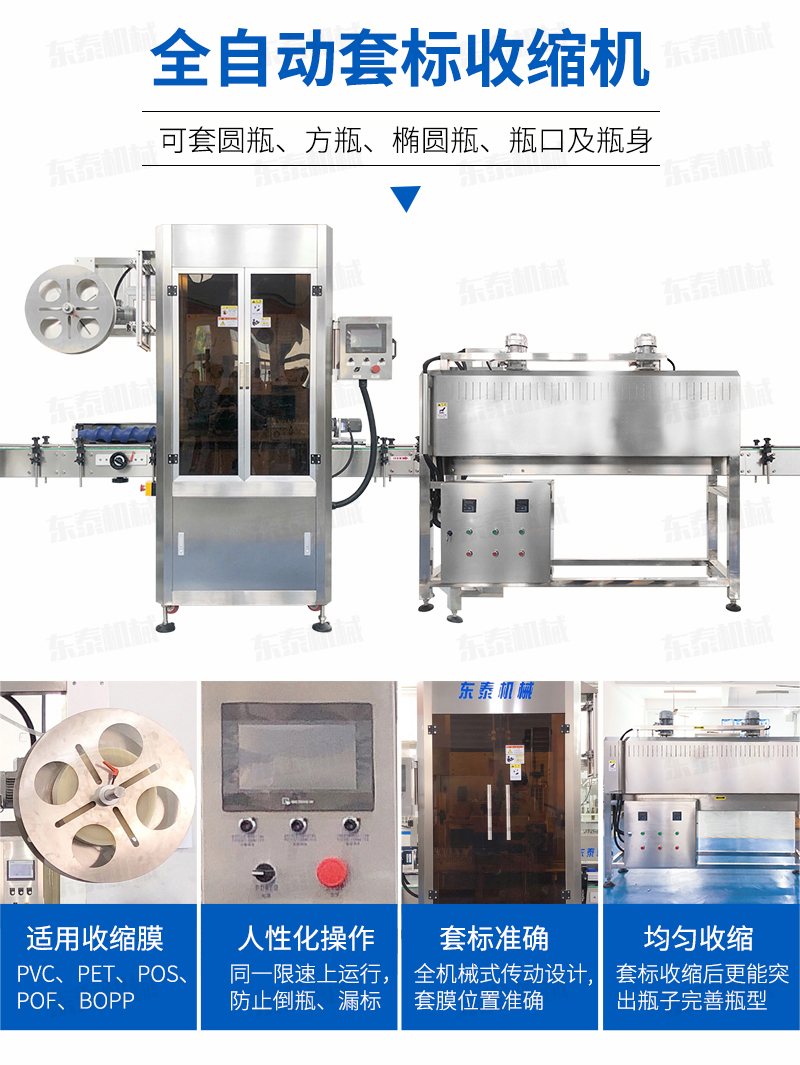 1. 本公司生產的套標機適用于各種瓶型的果汁、茶飲料、乳制品、純凈水、調味品、啤酒、運動飲料等食品飲料行業、不但套標位置度高,且收縮后更能突出瓶子完善瓶型。