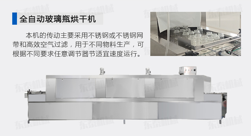 本機適用玻璃瓶及其它玻璃容器的干燥滅菌,食品等行業烘烤之用。 本機的傳動主要采用不銹鋼或不銹鋼網帶和空氣過濾,用于不同物料生產,可根據不同要求任意調節器節適宜速度運行。本機電熱元件選項用乳白色石英玻璃管為加熱元件,具有系數高、能耗低、升溫區、降溫區、冷卻區等區域,溫度范圍有50-300℃本機除機架外,全部采用不銹鋼材料制作,保溫材料采用硅酸鋁纖維,保溫性能好等優點,是制藥-食品-日化等行業的選擇。