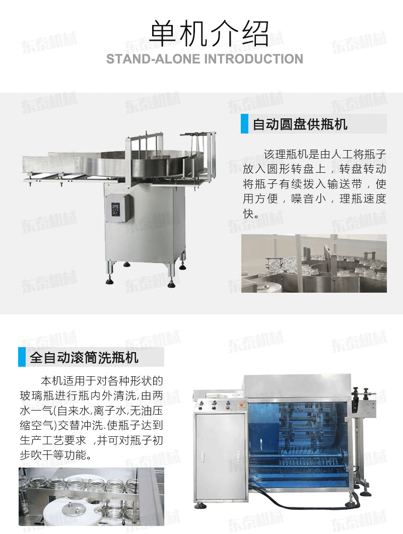 自動供瓶機(jī)+全自動滾筒洗瓶機(jī)+自動六米烘干機(jī)+自動收瓶機(jī)+全自動六頭灌裝機(jī)自動灌裝+全自動提蓋機(jī)自動理蓋、提蓋、掛蓋+六頭真空旋蓋機(jī)同時六個頭真空旋蓋+套標(biāo)機(jī)+收縮機(jī)+圓瓶貼標(biāo)機(jī)+整理平臺;