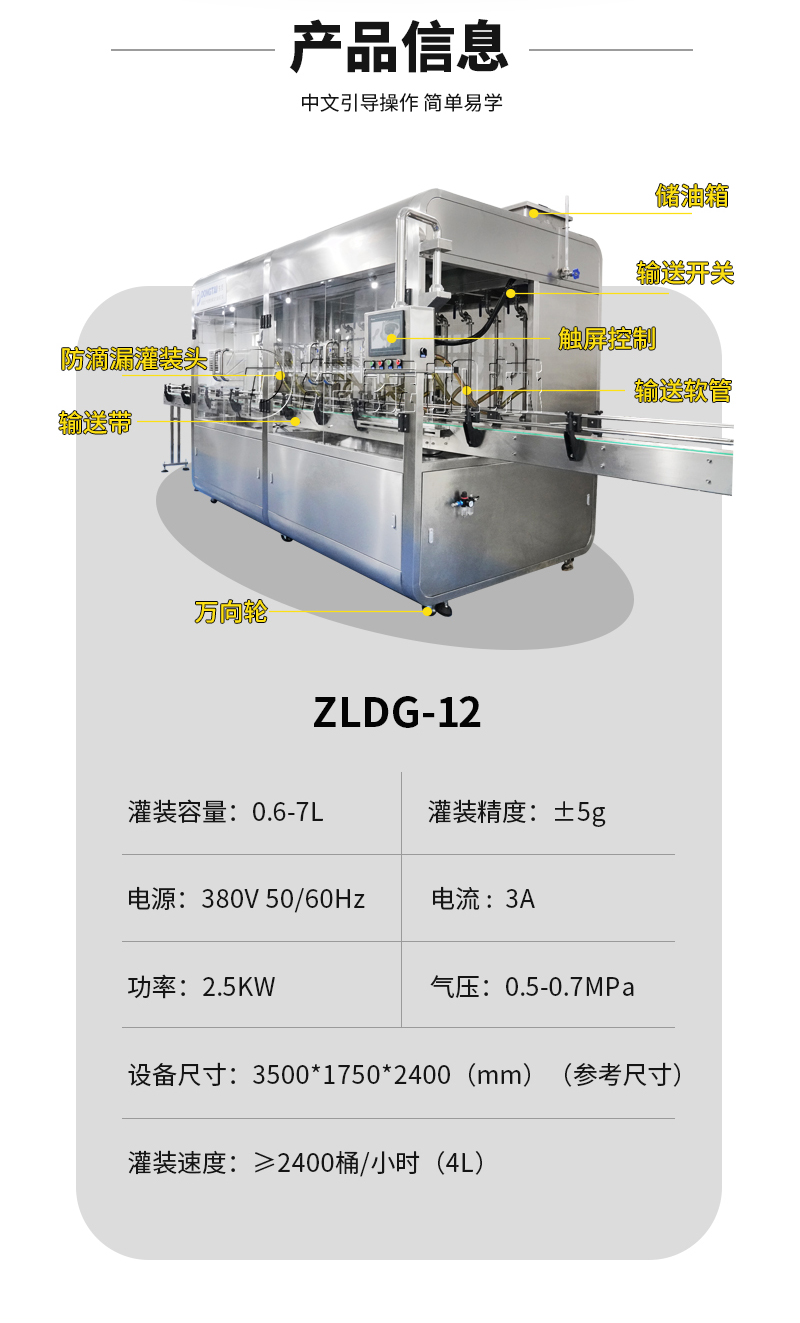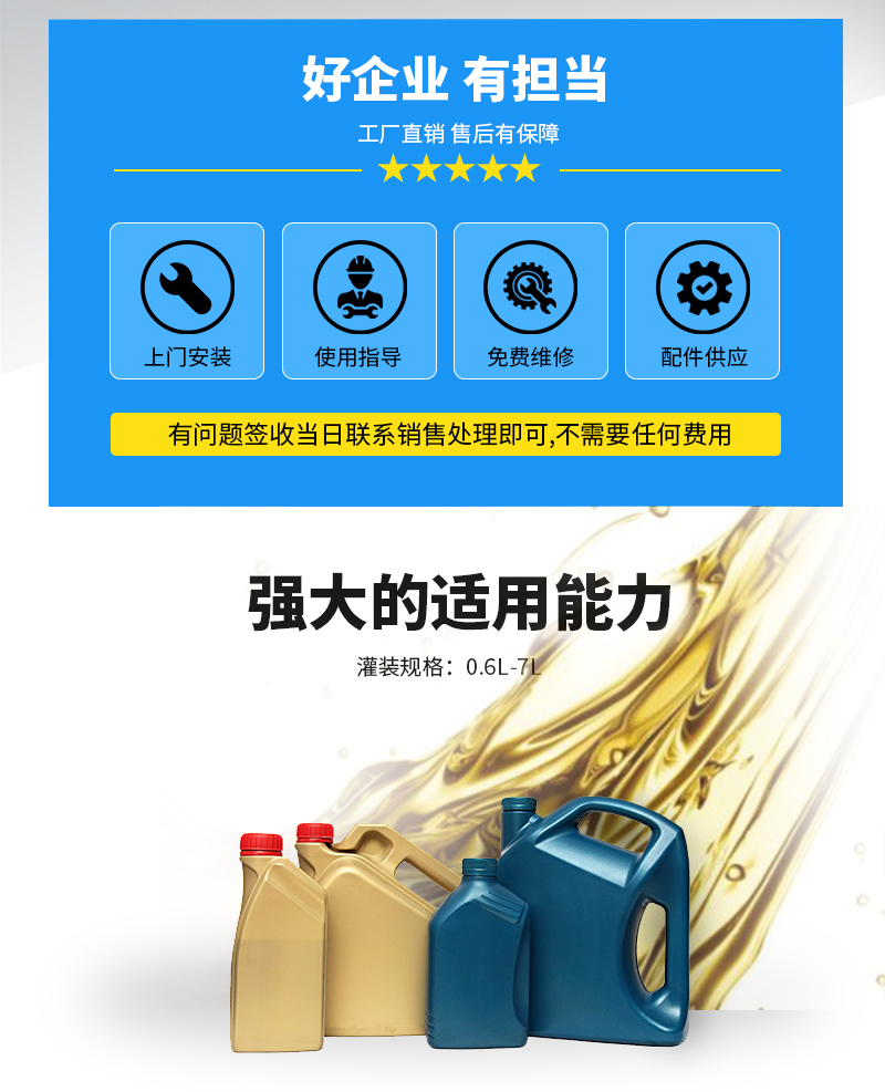 機(jī)器應(yīng)用范圍:1-10升通用型號(hào),機(jī)器采用流量計(jì)計(jì)量,觸摸屏控制,參數(shù)一鍵調(diào)整,方便快捷?梢怨嘌b各種油脂,油料。灌裝頭采用專用的油脂防滴漏灌裝頭,不滴漏。機(jī)器設(shè)定有快慢速技術(shù),可以先快后慢,防止物料噴濺。保持生產(chǎn)車間干凈潔凈。
