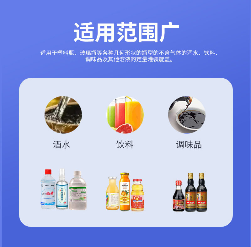 本機(jī)適用于多種材質(zhì),多種幾何形狀的容器,如塑料片、玻璃瓶、金屬瓶等;在需要更換瓶或蓋的時(shí)候,只要調(diào)整部分零件的位置即可,無(wú)需更換任何配件;在旋蓋過(guò)程中可以做到無(wú)瓶不下蓋。理蓋器、輸送機(jī)、旋蓋機(jī)、夾瓶皮帶速度可分別變頻調(diào)速,適應(yīng)在規(guī)定范圍內(nèi)的各類規(guī)格的旋蓋。(附:特殊規(guī)格定制即可)
